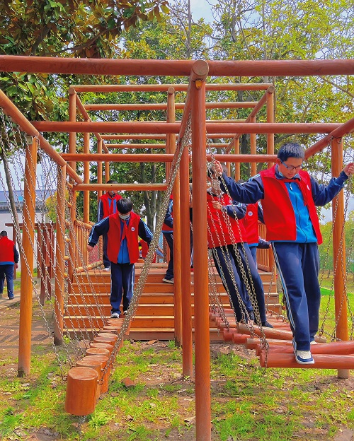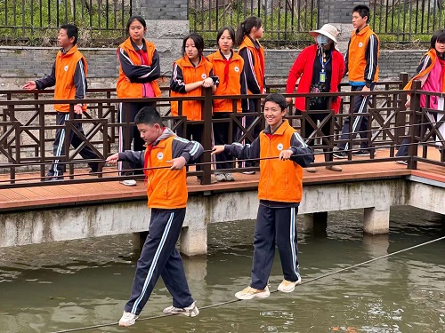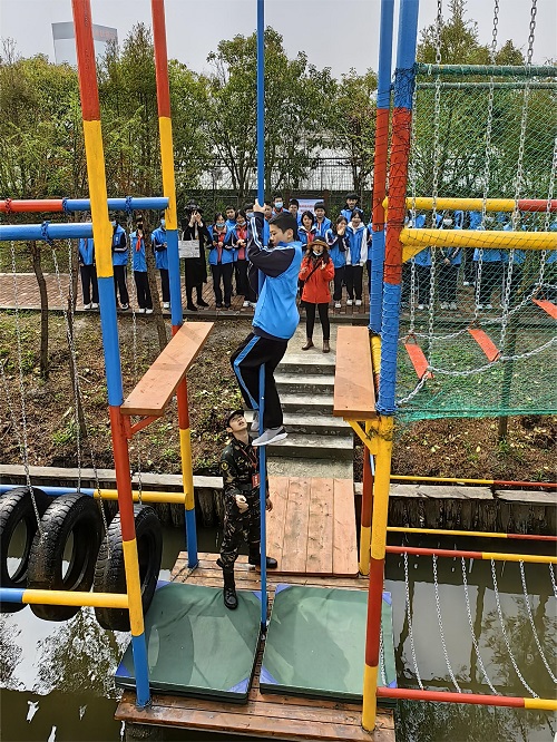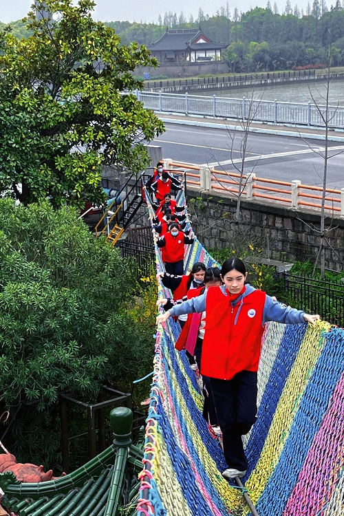 疁城学子们学思践悟,在浏河营地勇敢者道路中,体验了如“高空铁索”、“飞夺泸定桥”等“跋山涉水”体验项目,以实际行动学习革命先辈大无畏精神,勇敢实践、感悟体验。
