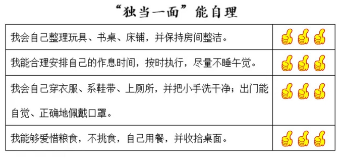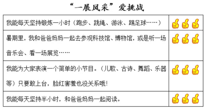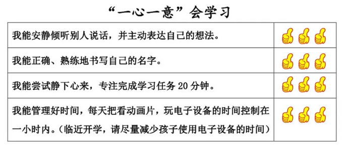 小朋友们,你们知道吗?小学生活和幼儿园有点不一样哦!生活作息、学习节奏、课堂形式都有了不小的转变,老师希望你们能在爸爸妈妈的帮助下,利用好这个暑假,做好充足的准备,来看看下面几条,你能做到多少呢?请你们给自己评评可以得到几颗大拇指奖章吧!